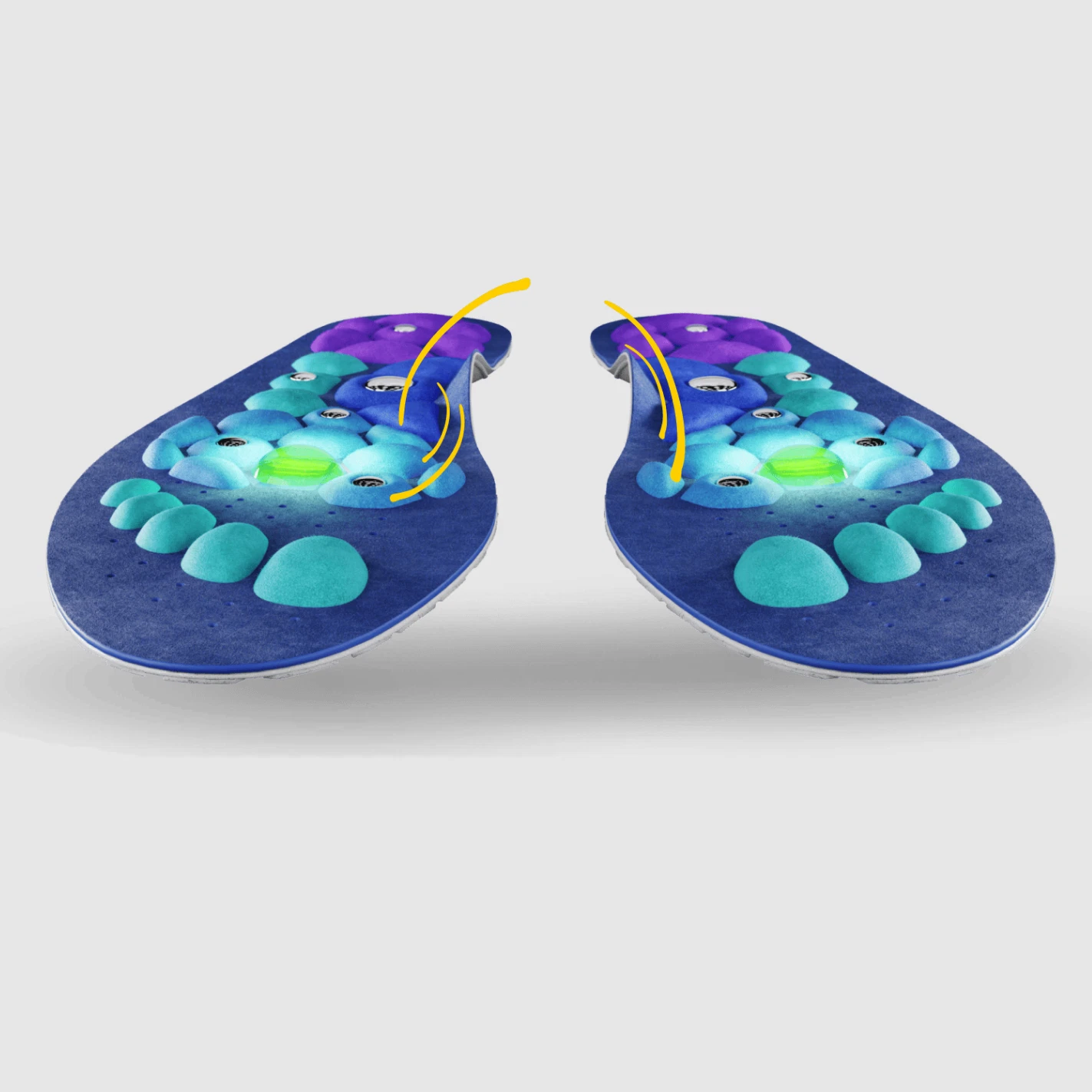 Durch gezielte Akupressurpunkte, eingebaute Magnetfelder und ein ergonomisches Fußbett fördern die Sohlen die Durchblutung, lindern Schmerzen und unterstützen die natürliche Körperbalance.